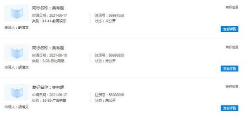 “美有姬”商標(biāo)已被自然人胡某搶注,國際分類含廣告銷售、教育娛樂、日化用品,申請(qǐng)日期為2021年6月,當(dāng)前商標(biāo)狀態(tài)為申請(qǐng)中。