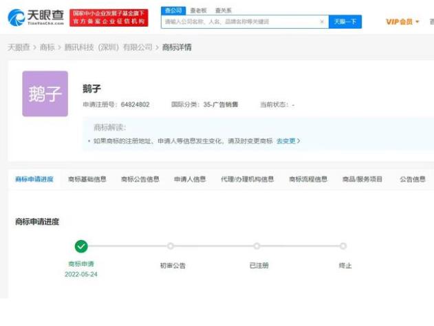 據(jù)天眼查App顯示,近日,騰訊科技(深圳)有限公司申請注冊多個“鵝子”商標,國際分類涉及科學儀器、廣告銷售、教育娛樂等,目前商標流程均為“申請收文”。