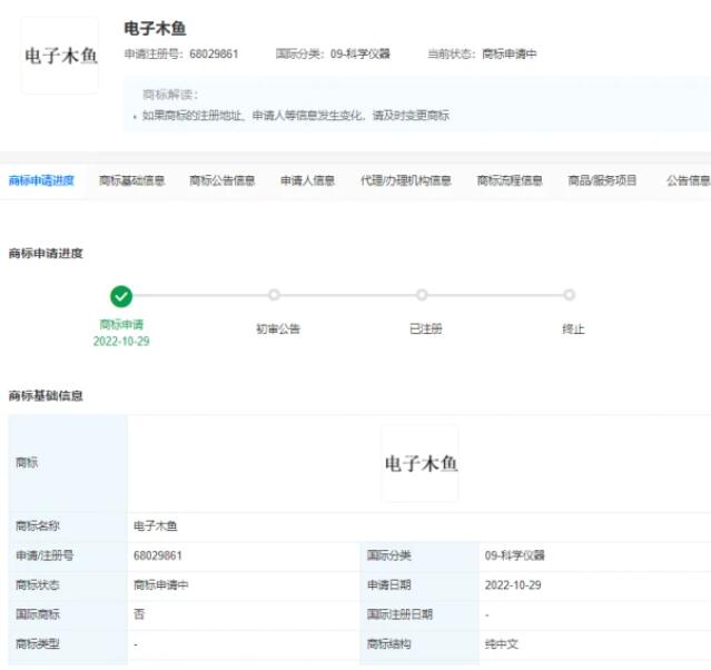 天眼查App显示,合肥某网络科技有限公司已申请注册“电子木鱼”商标,其国际分类为科学仪器,申请时间为10月29日,当前状态为商标申请中。此外,已有多家公司登记电子木鱼相关软件著作权,包括“木鱼软件”“电子木鱼软件”等。